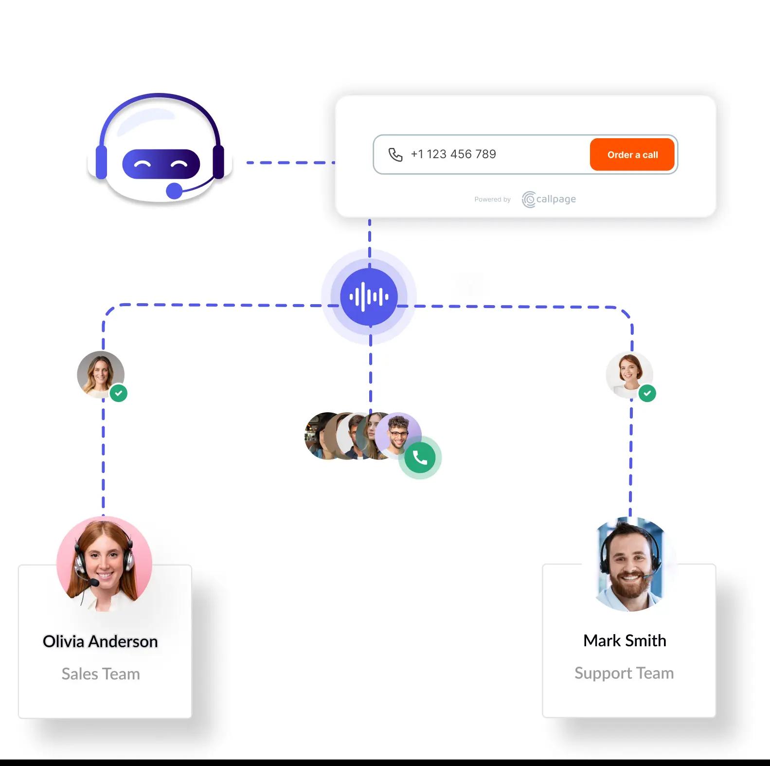 Kieruj każde zapytanie przychodzące do właściwej osoby. CallPage łączy routing połączeń, umawianie spotkań i Agenta Głosowego AI, który kwalifikuje i przekierowuje rozmowy. Dzięki temu ograniczysz utracone szanse, skracasz czas reakcji i równomiernie rozkładasz obciążenie zespołu.