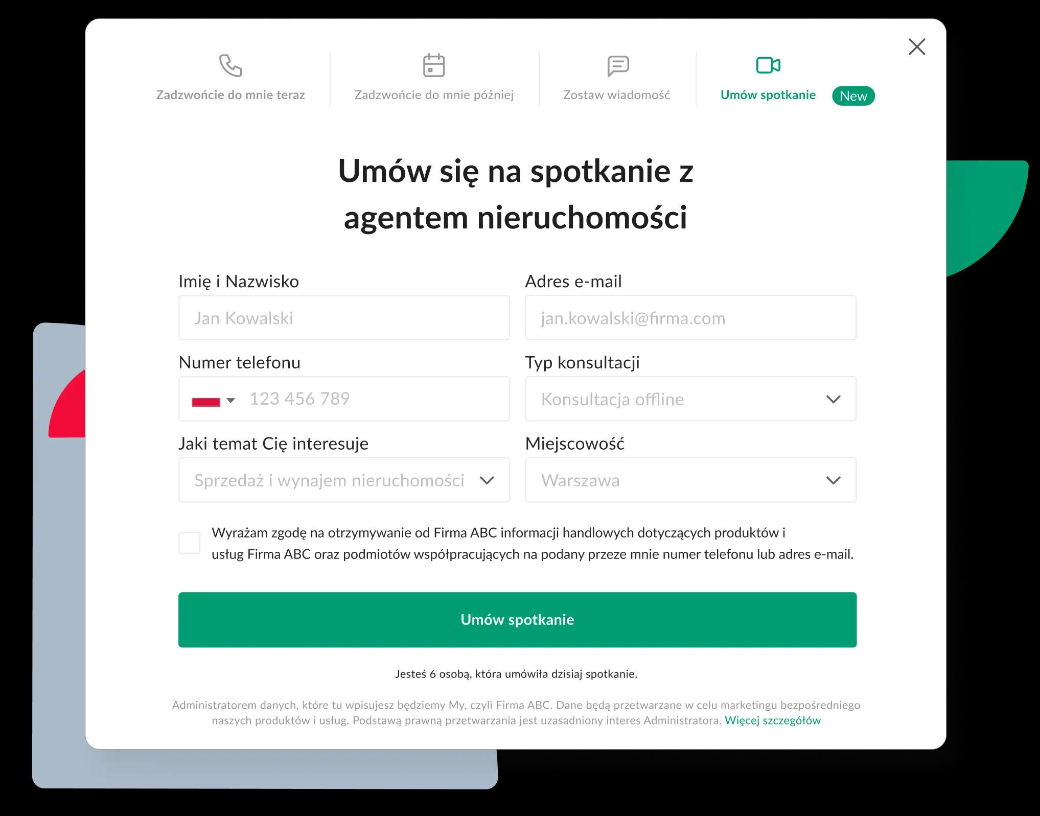 Zbieraj dane i potrzebne informacje o nieruchomościach przez formularz. Dzięki integracji z kalendarzami, system przedstawi rzeczywistą dostępność Twoich agentów. Proces umawiania spotkania trwa mniej niż dwie minuty. Zarówno kupujący jak i agent otrzymają potwierdzenie e-mailem lub SMS-em.
