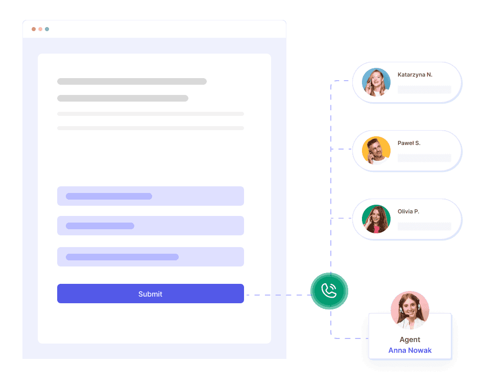 CallPage automatycznie łączy przychodzące połączenia z pierwszym dostępnym konsultantem po Twojej stronie. Jeśli nikt nie odbierze telefonu, system podejmuje kolejne próby połączenia. Potencjalni klienci mogą również zamówić automatyczne oddzwonienie na dowolny dogodny dla nich termin.